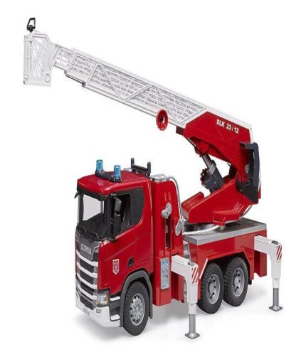 Igrača Gasilski tovornjak Scania Super 560R, je poleg vseh detajlov, kot so odpiranje vrat, zlaganje ogledal ipd., vozilo odlikuje tudi vgrajena posoda za vodo, ki jo lahko enostavno napolnite. Vodno cev je mogoče naviti, držati s figurami BRUDER (npr. BRUDER šifra: 60100 – ni vključeno v dobavo) ali pritrditi na lestveno košaro in ima popolnoma funkcionalno šobo. Vrtljiva lestev z reševalno košaro se lahko podaljša in nastavi po višini z ročnim kolesom. Poleg dveh sedežev v kabini je še dodaten sedež za figuro BRUDER na gasilski lestvi. Štirje raztegljivi stabilizatorji lahko zagotovijo stabilnost vozila v vsaki situaciji, velik predal za shranjevanje z vrati na tečajih pa nudi dodaten prostor za shranjevanje orodja. Svetlobni in zvočni modul s štirimi različnimi funkcijami, kot so hrup motorja, utripajoče luči in hrup sirene, je vključen v obseg dobave in dodatno povečuje igralno vrednost te dovršene gasilske službe.