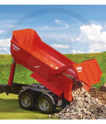 Igrača PRIKOLICA Krampe Kipper ima značilno detaljno zasnovo in tako kot original, enake prednosti pri močnem premikanju zemlje v peskovniku. Robustna konstrukcija, oblika tovora je optimalno centrirana, kar pomeni, da je težišče na sredini in je dosežena boljša stabilnost pri vožnji kot pri škatlastih nadgradnjah. Prekucni valj je nameščen sredinsko pred koritom, kar v originalu omogoča odličen prenos sile v korito med prevračanjem. Model ima tudi koristi od tega, z zaklepanjem korakov, ki obogati igranje in ponuja neprekosljiv videz. Krampe polcevna tandem prekucna prikolica je še en vrhunec v naši ponudbi BRUDER kmetijskih prikolic.